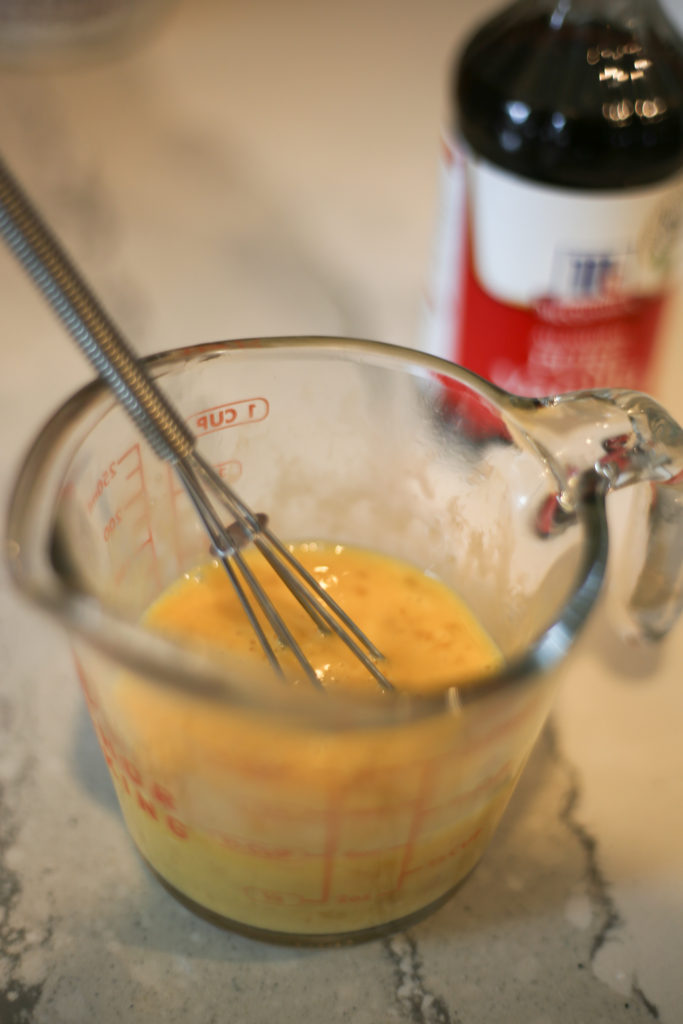 While the butter is melting, whisk together two eggs, and the vanilla extract.