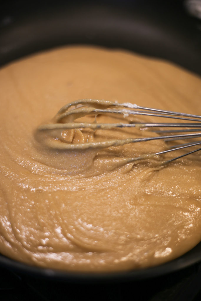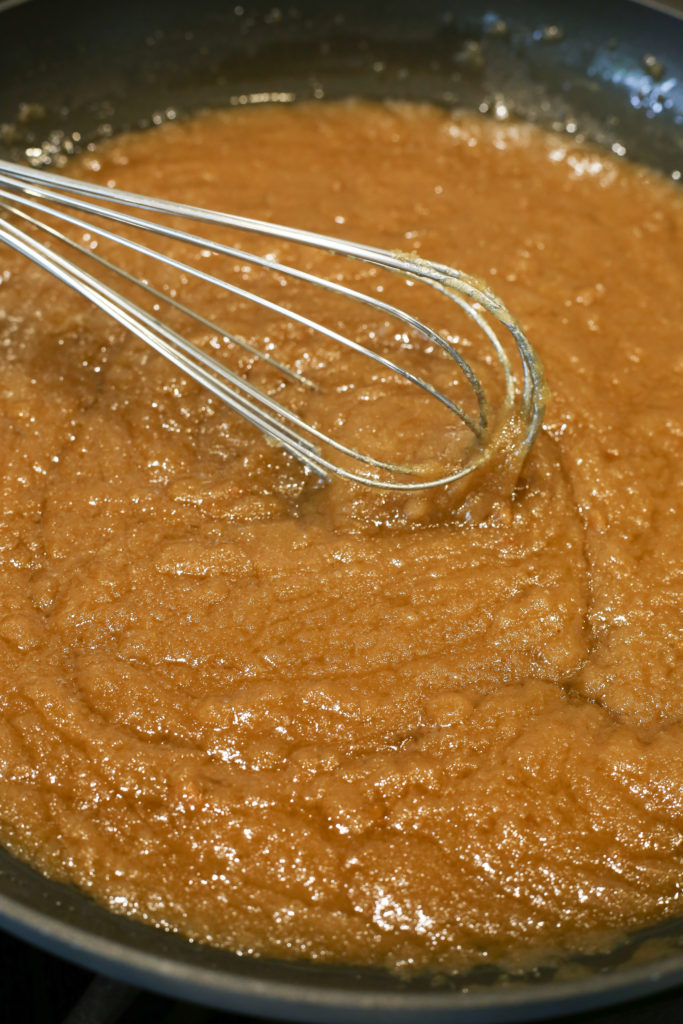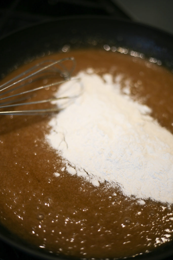 When the butter is all but melted, turn off the burner heat and start to whisk in the brown sugar.