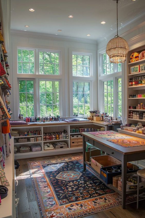 This bonus room idea is a sewing and crafters paradise with built in shelf storage a work station.