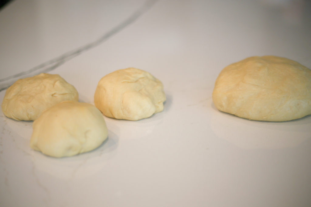 Take each half, and split those into 3 smaller balls, for a total of 6 dough balls.
