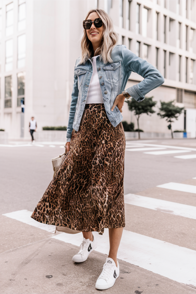 A printed shirt, white sneakers and denim jacket has both a sporty and girl vibe that is cute and fun!