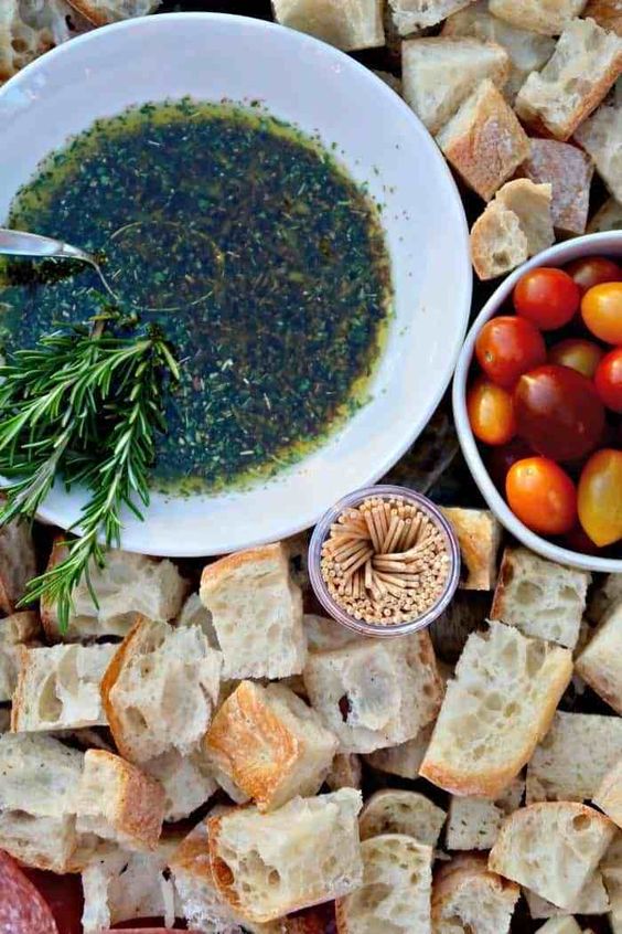I love the symmetry of the oil dipping bowls, and linear piles of sliced meats. Bright colors from fresh ingredients really make this board appealing!