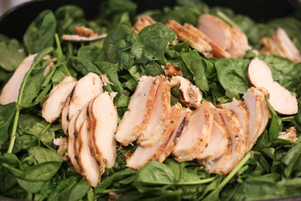 Fold sliced grilled chicken and fold into spinach and tomato mixture