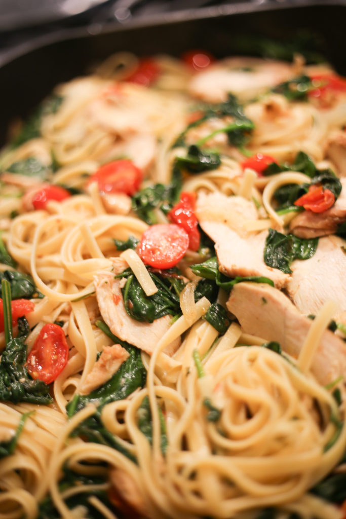 After I add the chicken and spinach, I pop the lid on and let the fresh veggies wilt down on very low heat (usually 4-5 minutes).
