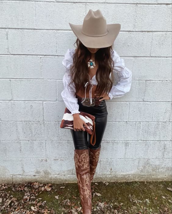 This killer cowboy style mixes leather pants, with statement over the knee boots.