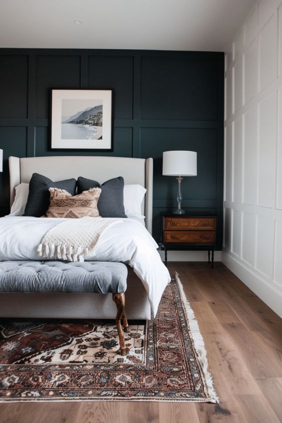This stunning moody and romantic bedroom features a dark accent wall with molding details.