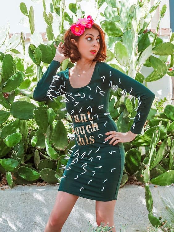 This “can’t touch this” cactus dress is brilliant, while the cactus flower head band really tops it off.