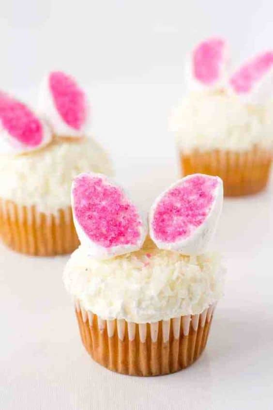 A coconut topped cupcake is decorated with split marshmallow ears dipped in pink sugar ~ adorable.