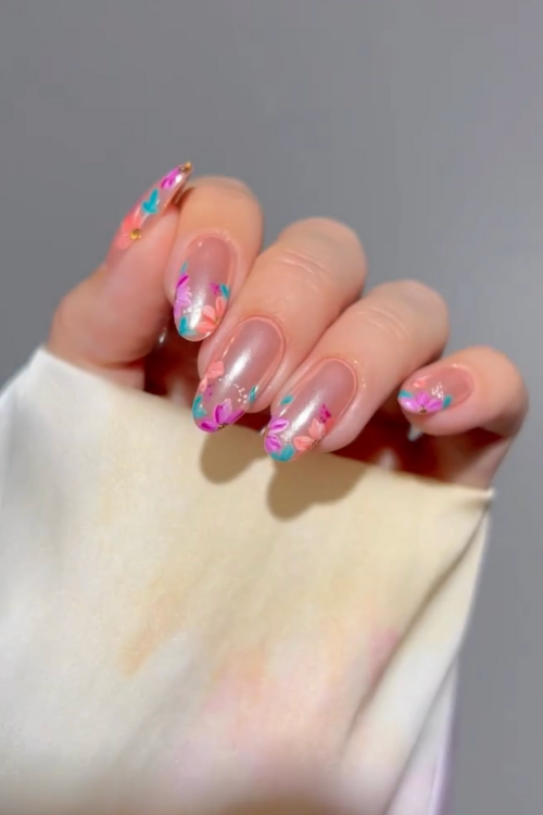 The bold colors in pretty floral designs are just so pretty on top of a clear nude base coat.