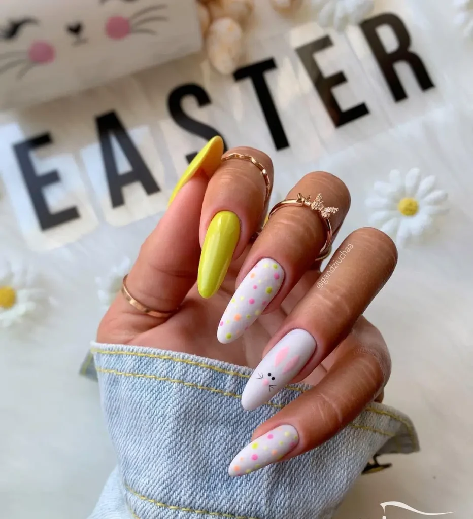 The bright yellow thump and pointed add a pop of color while white bunny polka dot accent nails round out the design.