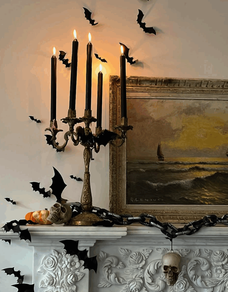 The simple mantle garland, and bats flying up the fireplace surround are classy and cute.