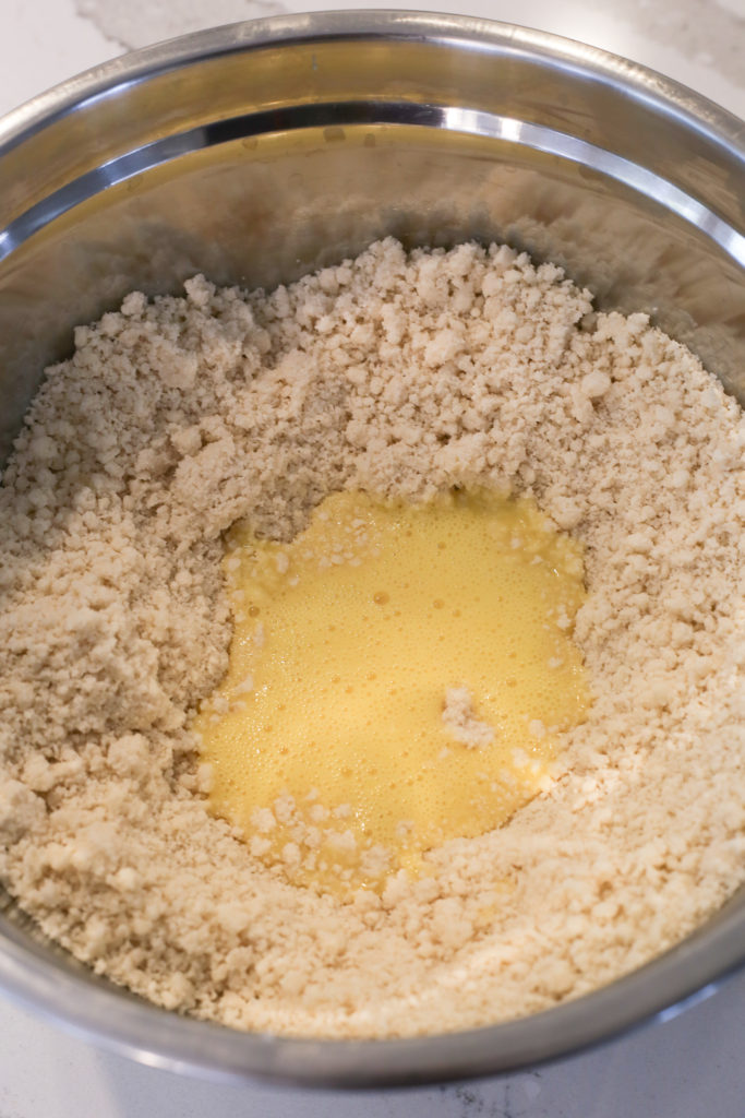 When wet ingredients are well combined, form a well in your dry ingredients and pour your egg mixture inside.