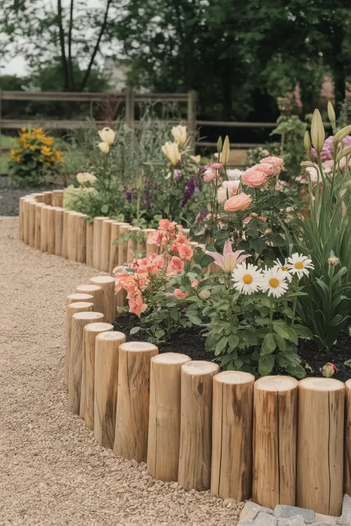 #21) Vertical Wooden Log Flower Bed Edging Idea