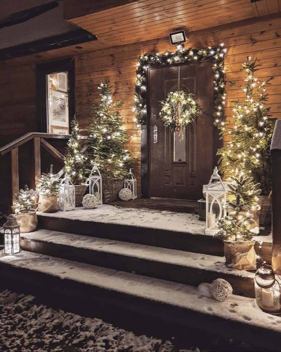 The long garland stretches over the entire porch area, while smaller lit trees frame the door, so cute!