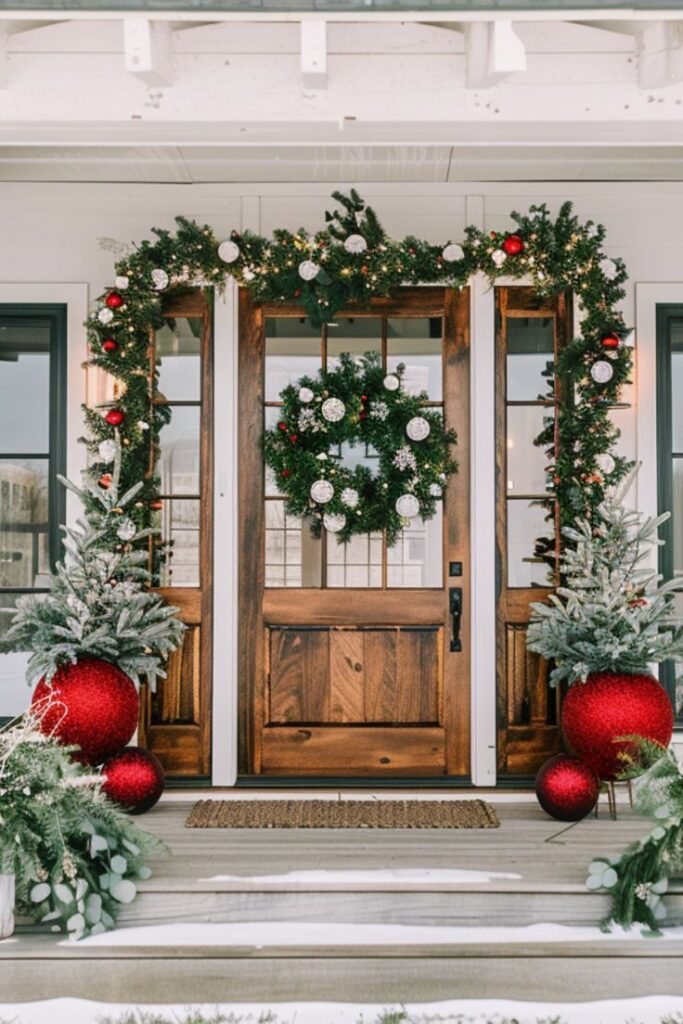 These oversized jingle bells and blended eucalyptus and pine garland strands really set this front porch Christmas decor apart.