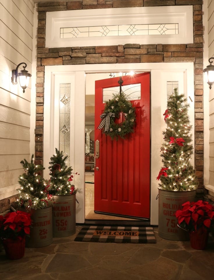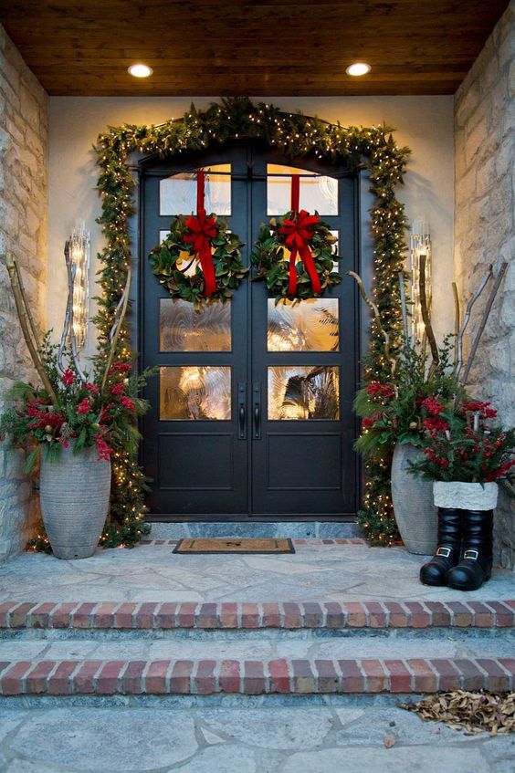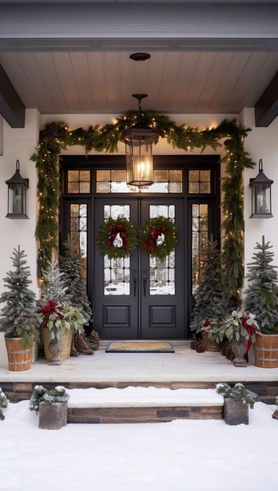 The large lit garland strung over the double doors frames the entry, while the potted evergreens provide the perfect fillers.