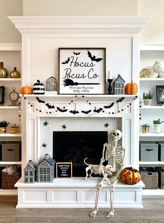 #24) Next Level Skeleton Mantle Halloween Decor Idea