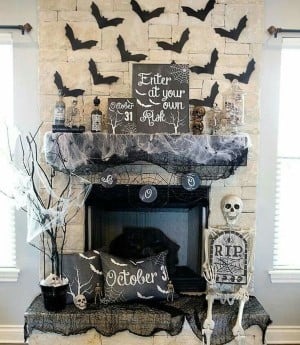 Most of the Halloween mantle designs we’ve look at has bats flying across the fireplace.