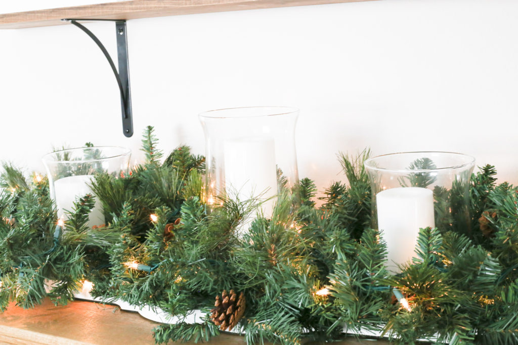 I normally have eucalyptus vines wrapped around the candles. This was a great place to change out greenery for some pretty lit evergreen garland.