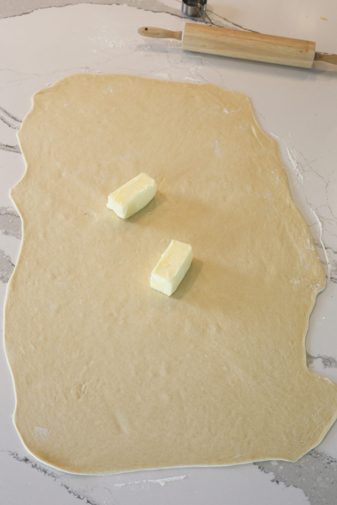 Lightly flour a surface and use a rolling pin to shape your dough into a somewhat rectangular shape.