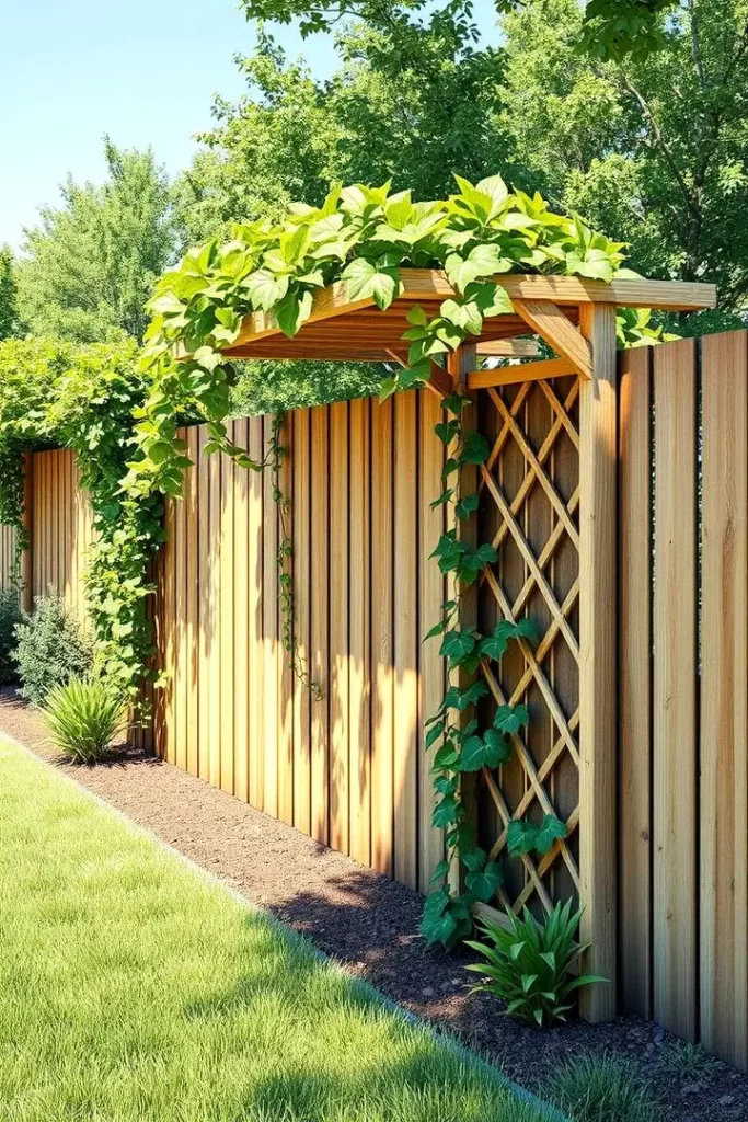 Adding a trellis for climbing plants is a great option to add vertical color and greenery along the fence line.