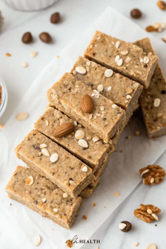 These delicious no bake protein bars are packed with peanut butter, nuts, flax seeds and monk fruit sweetener.