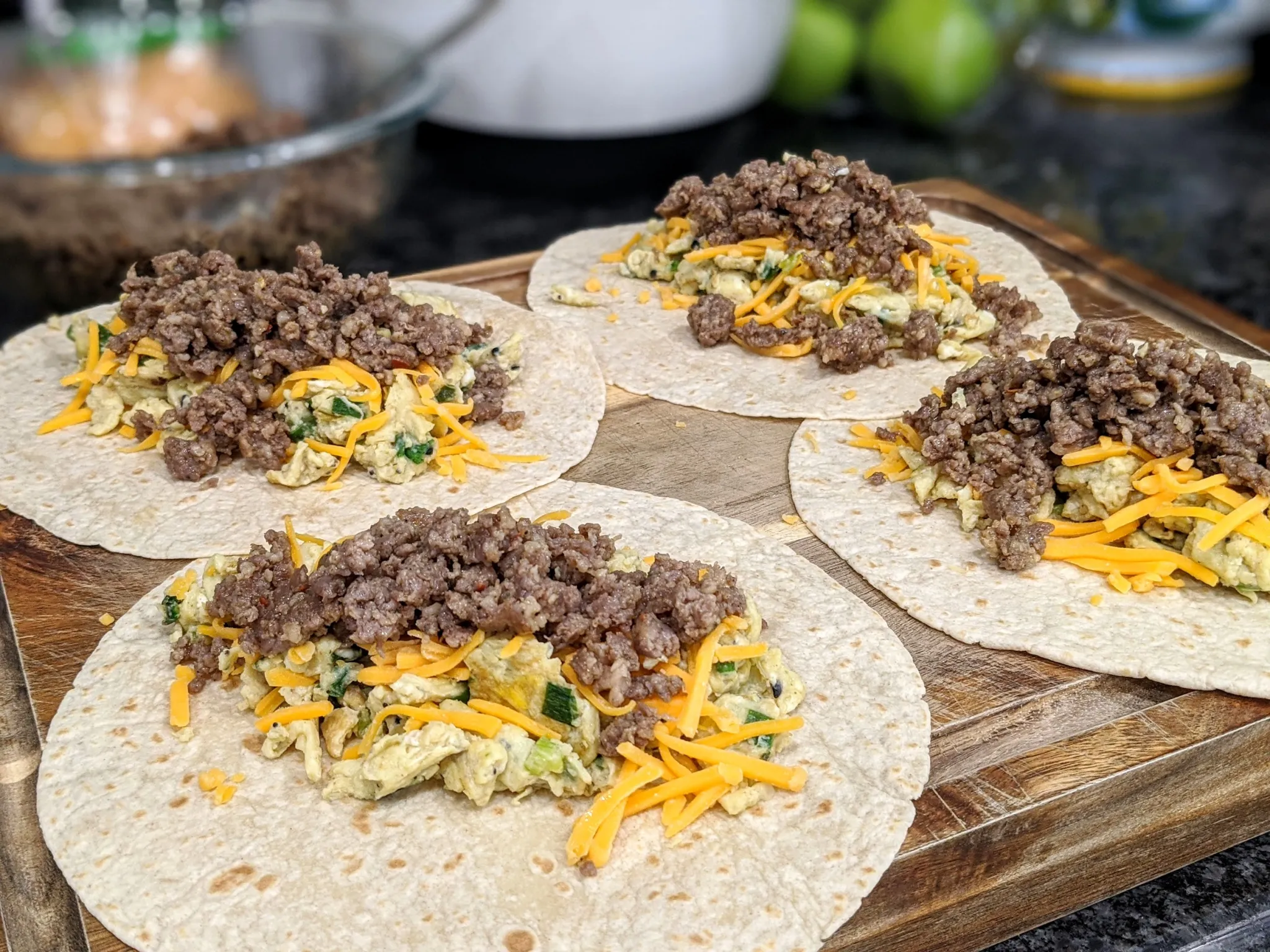 Using a low carb tortilla helps rid any excess sugars when packed with sausage, eggs and cheese.