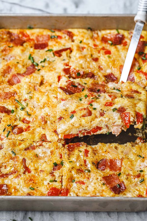 The best flavors, without the crust you will love this easy sheet pan bacon and egg bake.