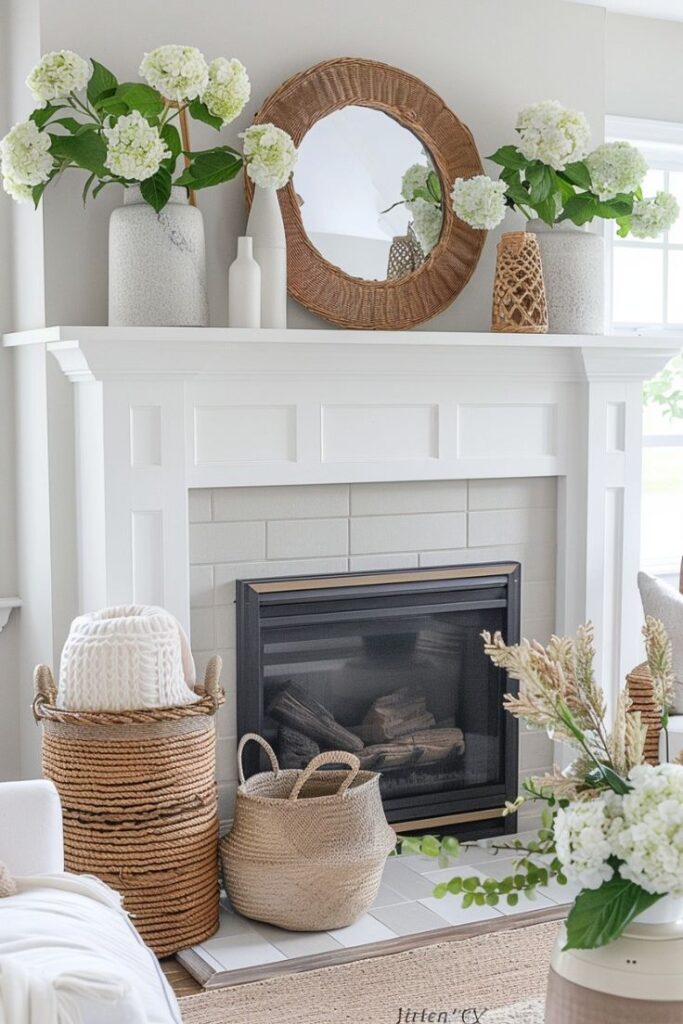 Wicker and soft earthy textures are wonderful farmhouse style mantel decor.