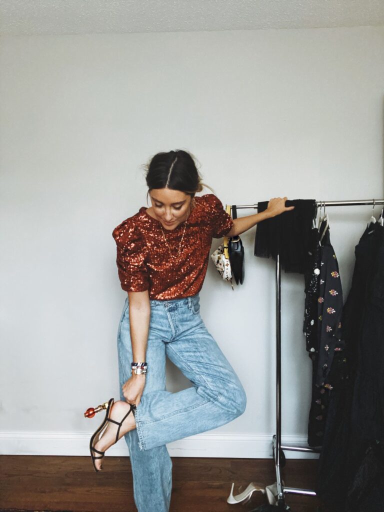 I love the wide leg denim, sequins top and unique pumps for a fun party style.