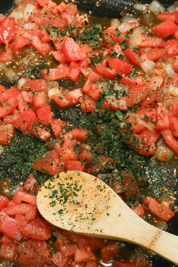 7. While onions are cooking, prep tomatoes by dicing and add them to the pan when the garlic and onions are tender and caramelized. Stir and gently scrape up browned bits off the bottom of the pan.