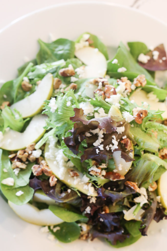 This pear salad has tangy sharp feta cheese, candied pecans and a delicious yet simple red wine vinaigrette.