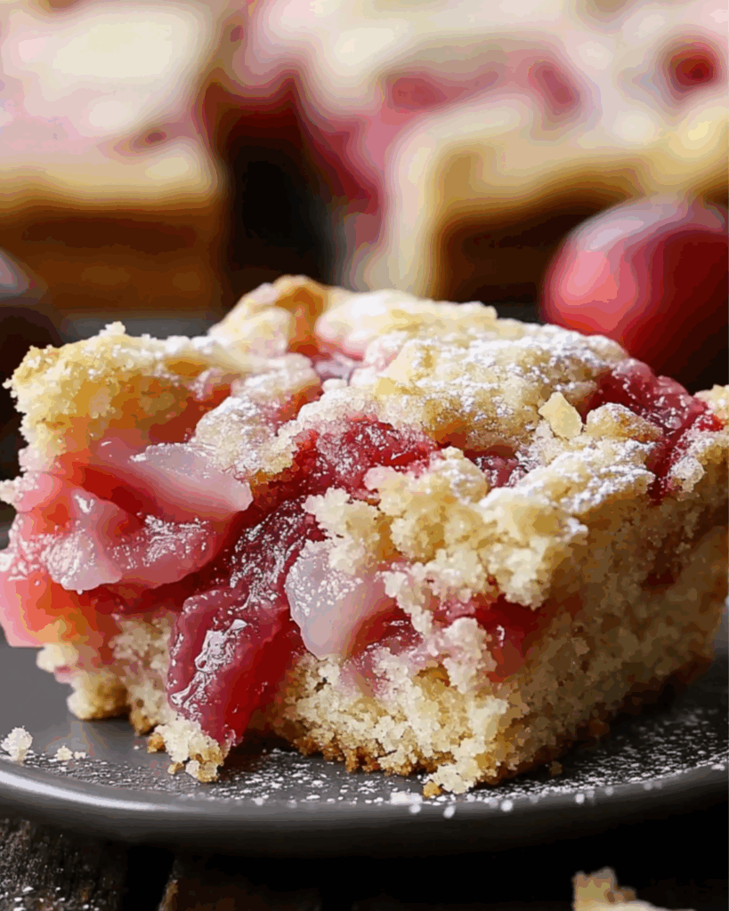 Gooey tart and tangy rhubarb filling on a buttery shortbread crust ~ they won’t last long.
