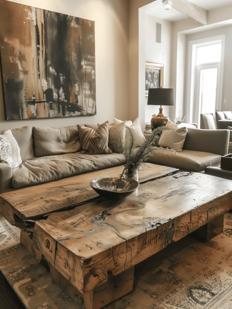 Large abstract art looks incredible with rustic finishes, like this reclaimed wood coffee table.