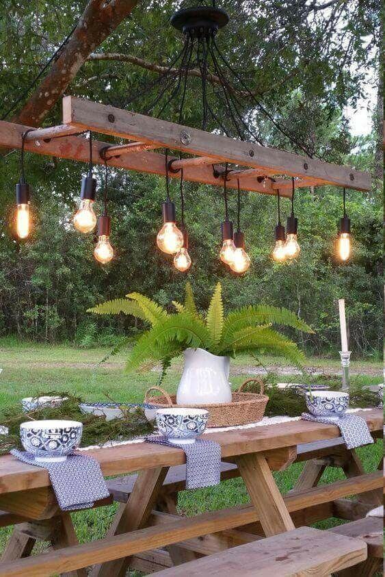 How cool is this repurposed rustic wooden ladder light over this outdoor seating area!