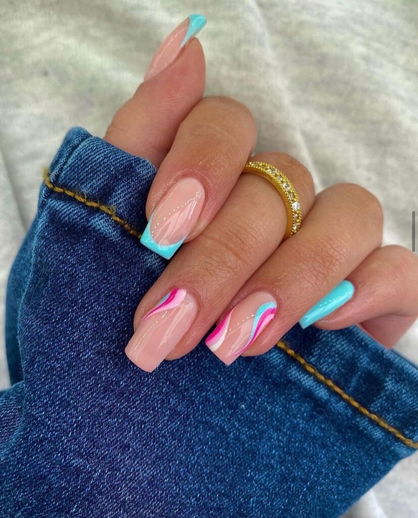 Light blue, bright pinks, and fun swirls add detailing and design style to this spring manicure.
