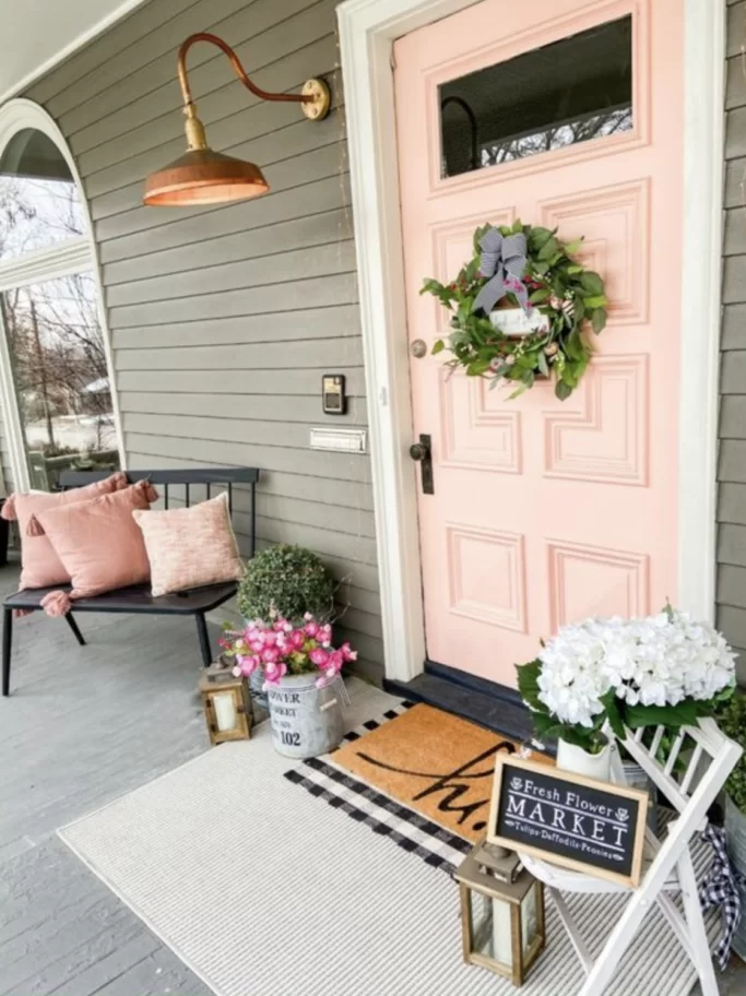 This gorgeous and unique pastel pink front door is a creative and fresh statement to build your summer decor around.