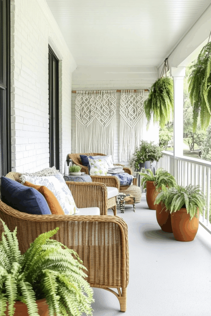 The macrame hanger works well on the covered porch wall, while potted ferns add softness and color.