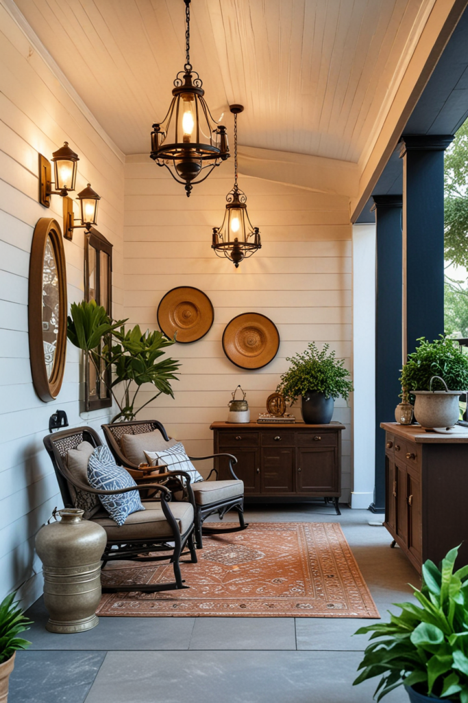 Covered porch wall hangings, a patterned rug, and vintage pendant lights give this front porch southern charm.