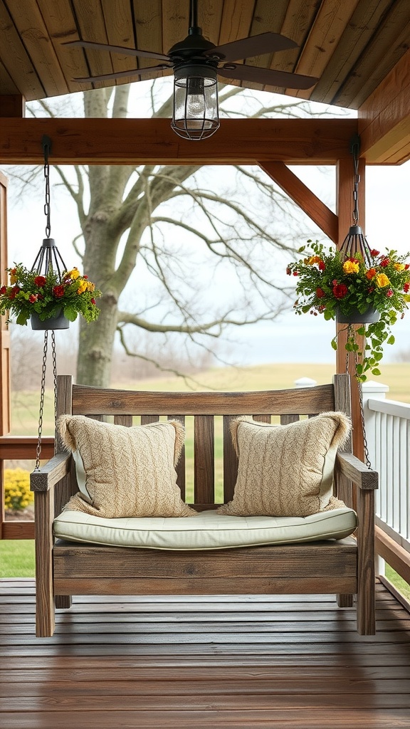 Hanging a bench high enough to swing makes a lovely summer porch seating area, with hanging flower pots as decor.