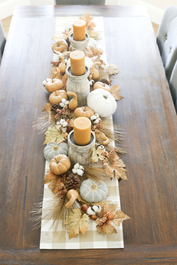 Two larger weighted white pumpkins anchor the design on the ends, while the candle featured centerpiece anchors the table.