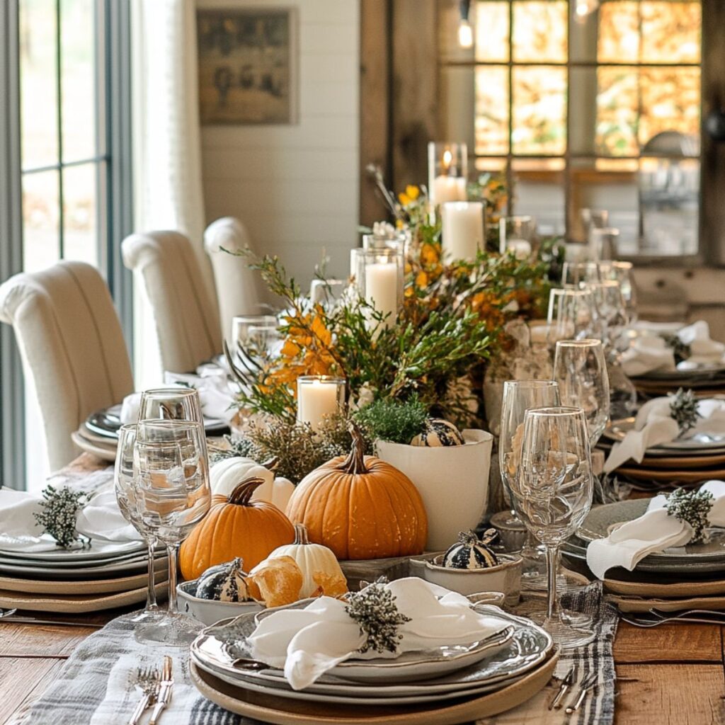 #17) Farmhouse Thanksgiving Table Setting With Anchored Pumpkins