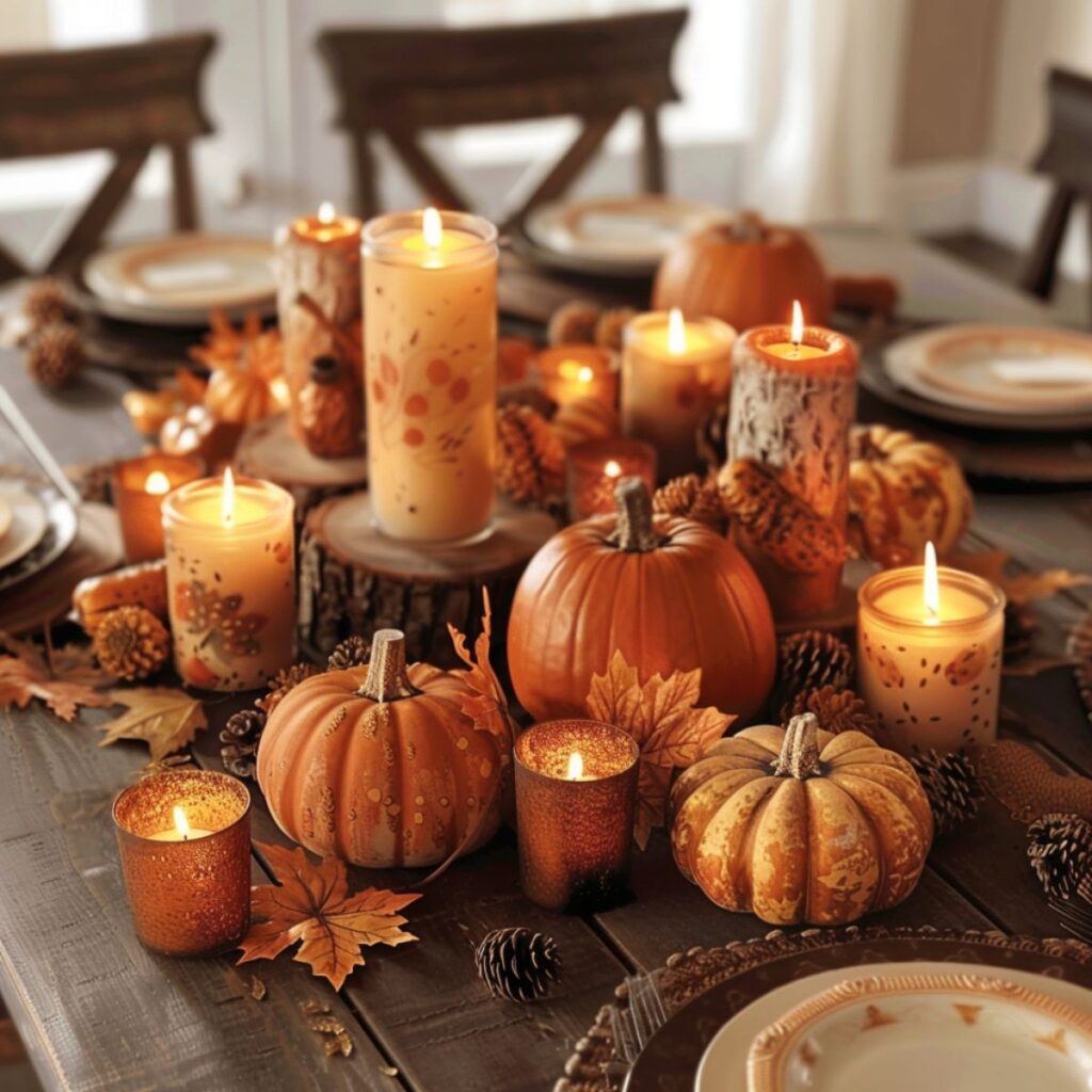 Sometimes beautiful Thanksgiving tablescapes are as easy as grouping pumpkins and candles together.