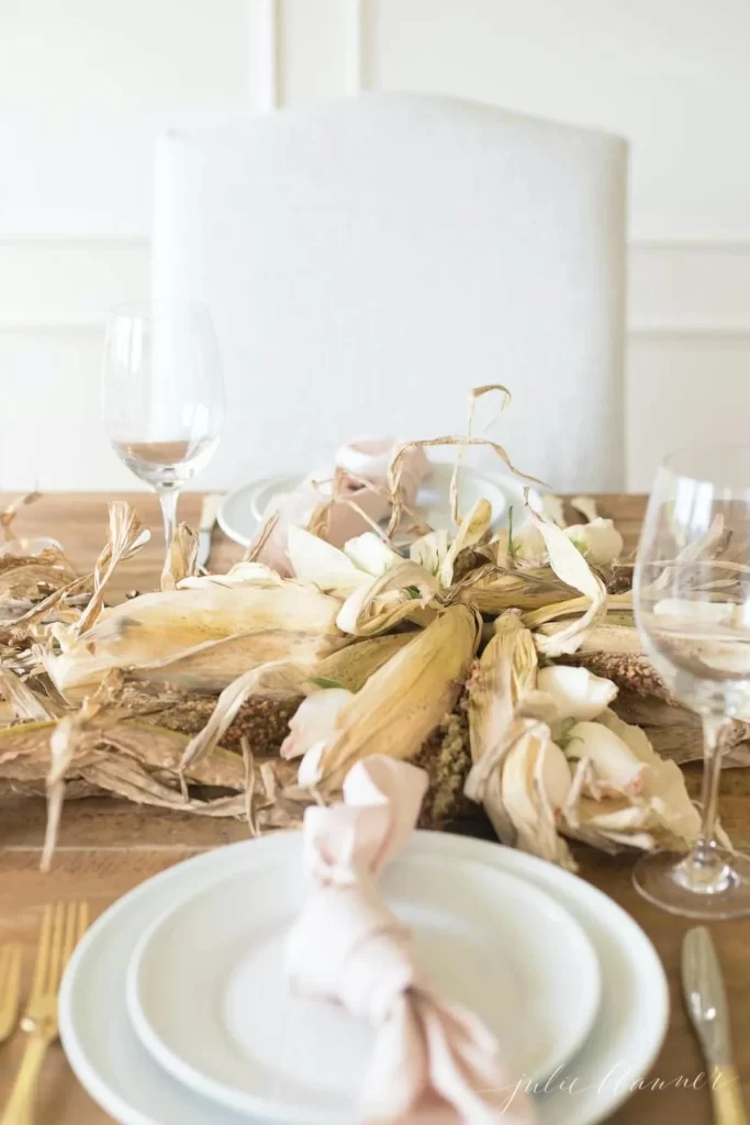 #10) Cornhusks & Flowers Thanksgiving Table Decor Ideas