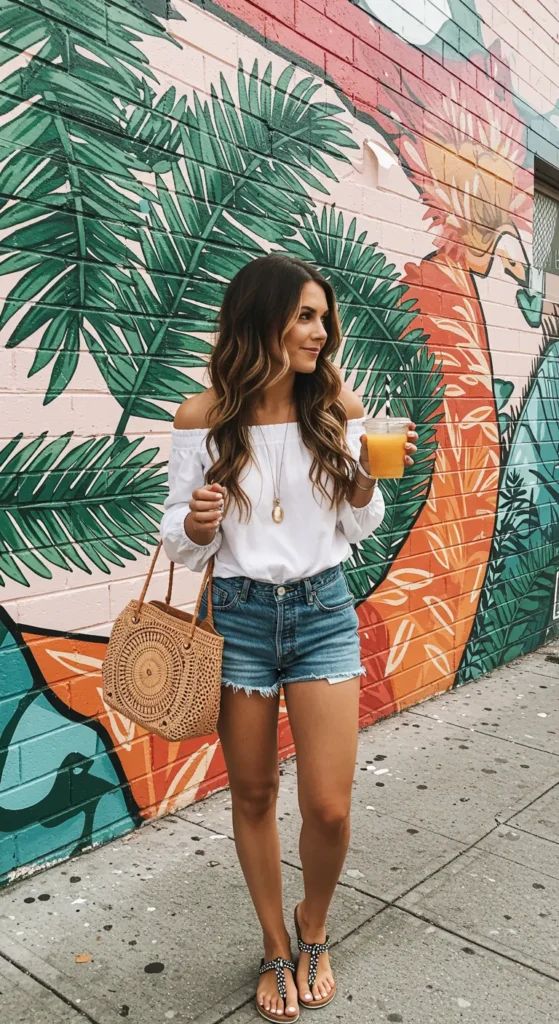 This classic pair of cut offs and sandals instantly look like stylish with this off the shoulder top and cute natural fiber bag.