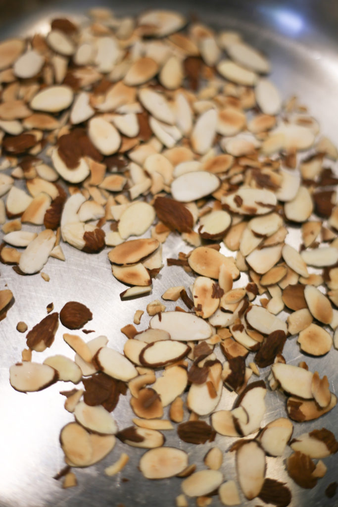 3. Place sliced almonds in a dry pan on medium heat, stirring occasionally until toasted and golden brown. Remove almonds from heat to cool.